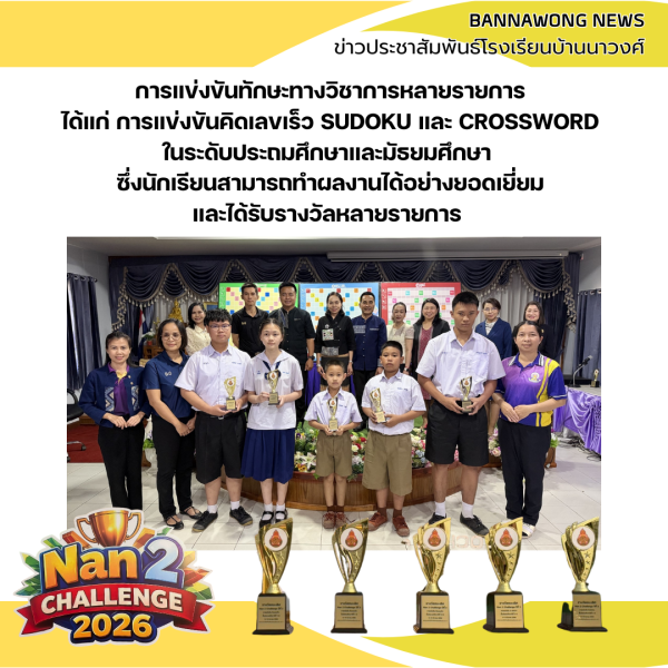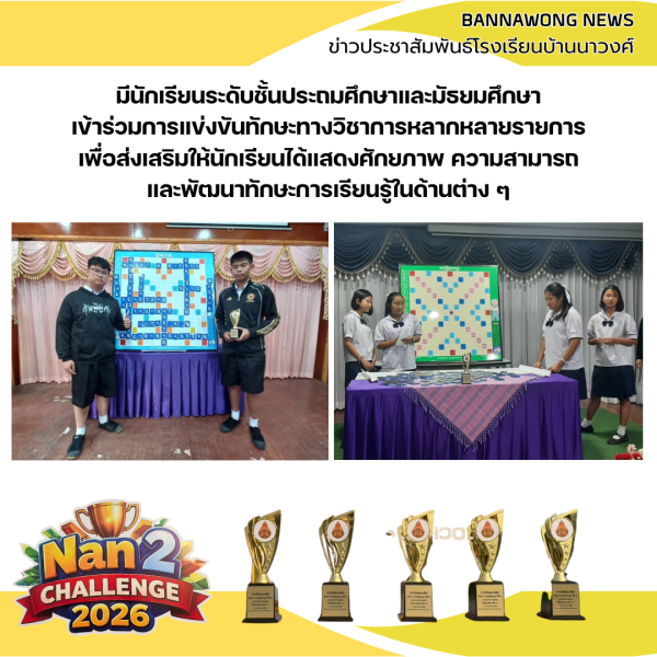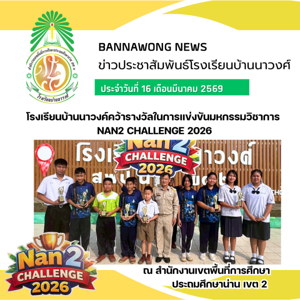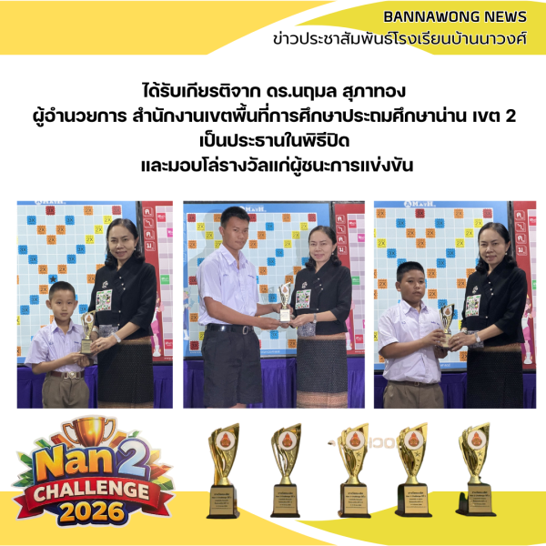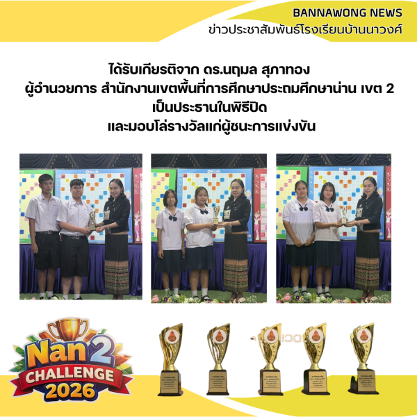 โรงเรียนบ้านนาวงค์ได้นำนักเรียนเข้าร่วมการแข่งขัน Nan2 Challenge 2026 ณ สำนักงานเขตพื้นที่การศึกษาประถมศึกษาน่าน เขต 2 โดยมีนักเรียนระดับประถมศึกษาและมัธยมศึกษาเข้าร่วมแข่งขันทักษะทางวิชาการหลากหลายรายการ ซึ่งนักเรียนสามารถทำผลงานได้อย่างยอดเยี่ยมและได้รับรางวัลหลายรายการ สร้างความภาคภูมิใจให้แก่โรงเรียน คณะครู และผู้ปกครองเป็นอย่างยิ่ง.